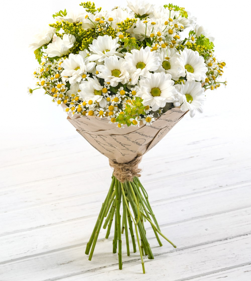 1 хризантемных ромашек, 1 ромашка матреаркария, 1 солидаго, зелень, упаковка, лента3 хризантемных ромашек, 2 ромашки матреаркария, 2 солидаго, зелень, упаковка, лента5 хризантемных хризантем, 6 ромашки матреаркария, 3 солидаго, зелень, упаковка, лента
