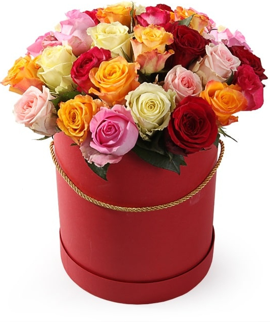 27 ярких разноцветных роз, оазис, коробка35 ярких разноцветных роз, оазис, коробка